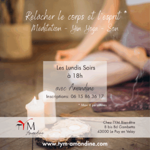 Chaque lundi soir, dans l’espace dédié TYM Bien-être, au cœur du Puy en Velay, je vous invite à me rejoindre pour explorer la méditation sous différentes formes et vous relâcher en profondeur soutenu par la respiration, les postures de Yin yoga, le son et la voix. ...