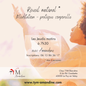 Retrouvons-nous les jeudis matin pour un temps de méditation matinale et de pratique corporelle ensemble, en petit groupe de 4 personnes max pendant toute l'année scolaire 2025 - 2026 chez TYM Bien-être au Puy en Velay (43) ...