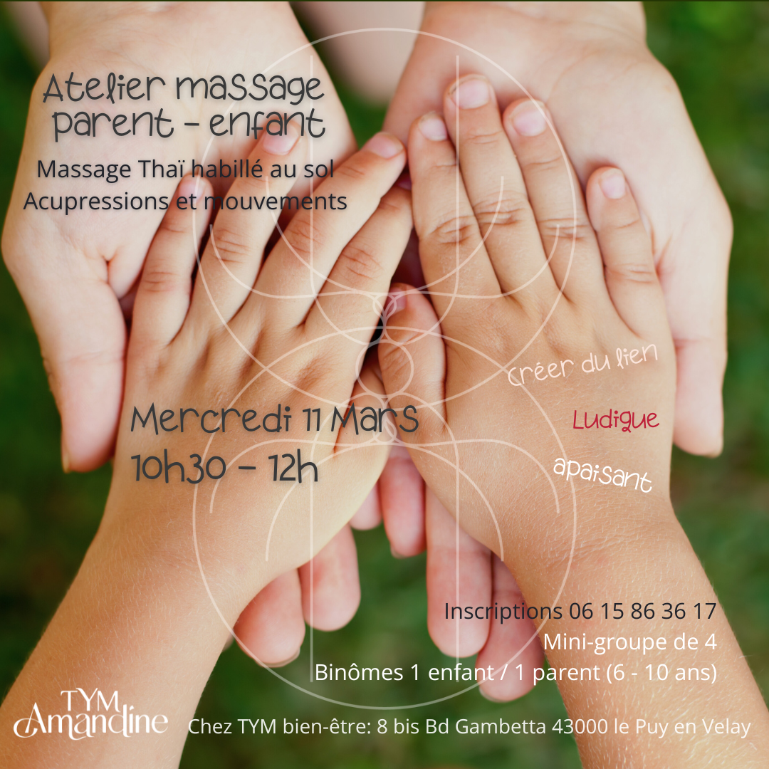 Sur futon, habillé, sans huile et au sol, je vous propose de pratiquer des acupressions simples et des mouvements issus du massage Thaï avec votre enfant.
