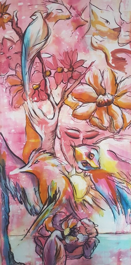 Le lendemain et les jours suivants, je vais observer ce tableau et découvrir encore une autre lecture. une lecture de spectatrice, trouver beaucoup de symboles, de messages, et de choses liées à ma vie personnelle, à mon chemin, à des questions que j’ai, à des rêves… je suis étonnée. et ravie. Ces formes ne sont pas là par hasard