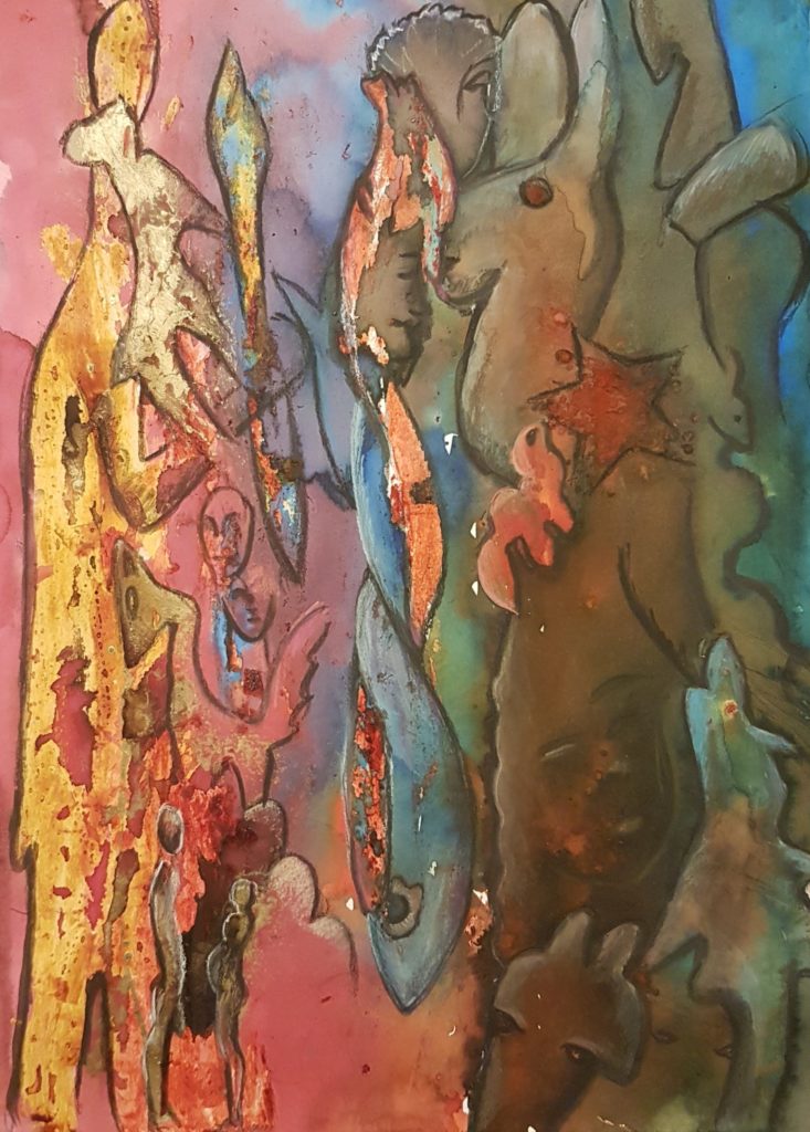 La première est ce grand personnage, ce grand homme, qui prend toute la feuille et qui tient une lance ou un bâton ( plutôt une arme pour moi), il me fait penser à ces peintures rupestres… les autres formes sont plutôt simples, il y a un côté brut dans la représentation, il y a des statues il y a surtout cette figure centrale entrelacée rouge et bleu, dragon du feu et dragon de l’eau qui s’enlacent comme le yin et le yang, tête bêche… il y a des statues un lapin, une chèvre, un requin…