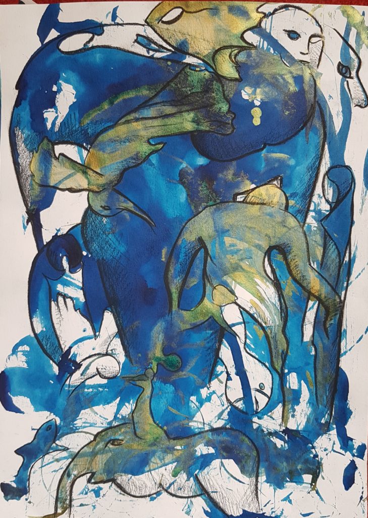 J’ai perçu une première silhouette immense en train de prendre forme et de se soulever, de naître d’elle-même. Ce personnage trapu, fort, replié sur lui même et qui se redresse semble contenir tout le cosmos en lui, être le cosmos… Il y a quelque chose de premier, de magmatique, de l’ordre de la formation vers la matière dans l’énergie… comme une terre glaise dont les particules se rassemblent pour former un être…. je perçois cette symbolique d’une naissance à moi-même.